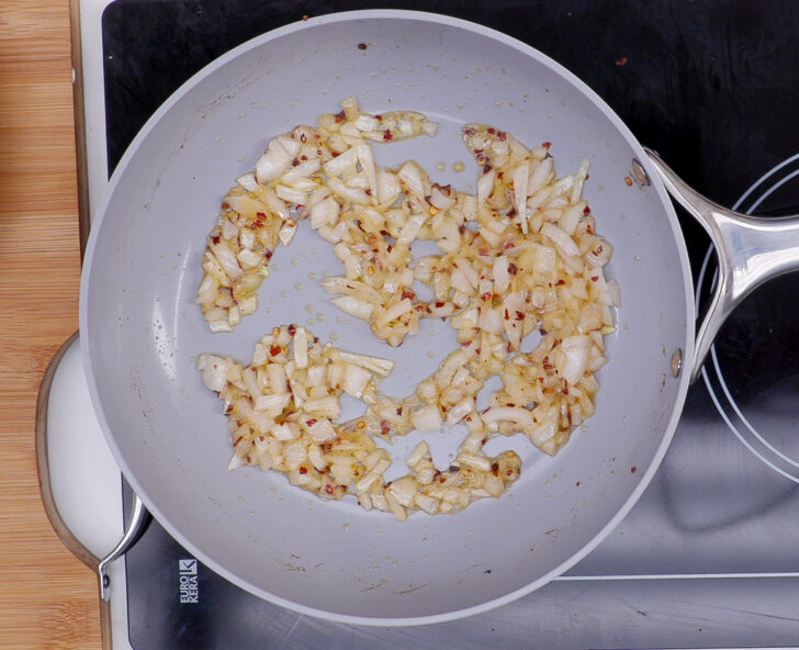 - Add red pepper flakes and cook for about 30 seconds to bloom them. (They will turn a brighter red)¼ teaspoon red pepper flakes