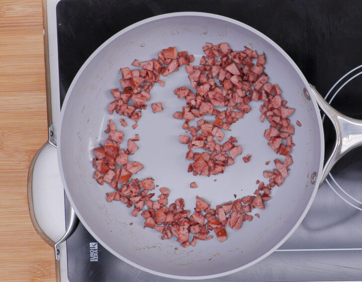 - In a medium-sized skillet, on medium heat, cook the smoked sausage until charred around the edges. Remove from the pan and set aside, but leave any remaining bits and fat in the pan.½ heaping cup smoked sausage (fully-cooked)